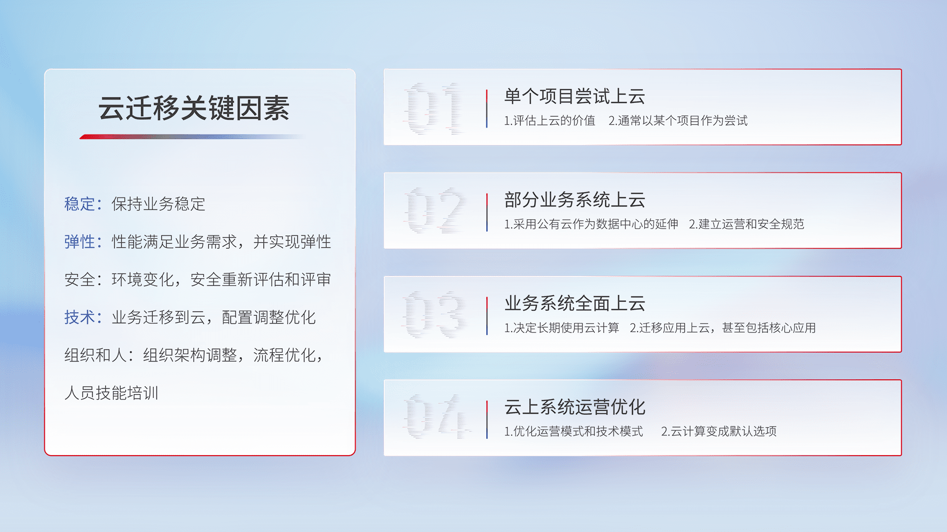 结合实际业务,,,,从规划设计、、、、云平台选型、、云原生改造、、、数据迁移、、、集成交付,,迁移全过程为客户识别最佳上云路径,,,做好风险识别管理,,,设计网络架构、、、身份权限、、安全审计合规、、、操作审计、、、日志审计、、、、监控告警策略、、、多站点容灾设计等,,,对云上基础设施进行整体规划,,,,提升IT治理水平,,,以满足弹性、、、高可用、、高性能的需求。。。